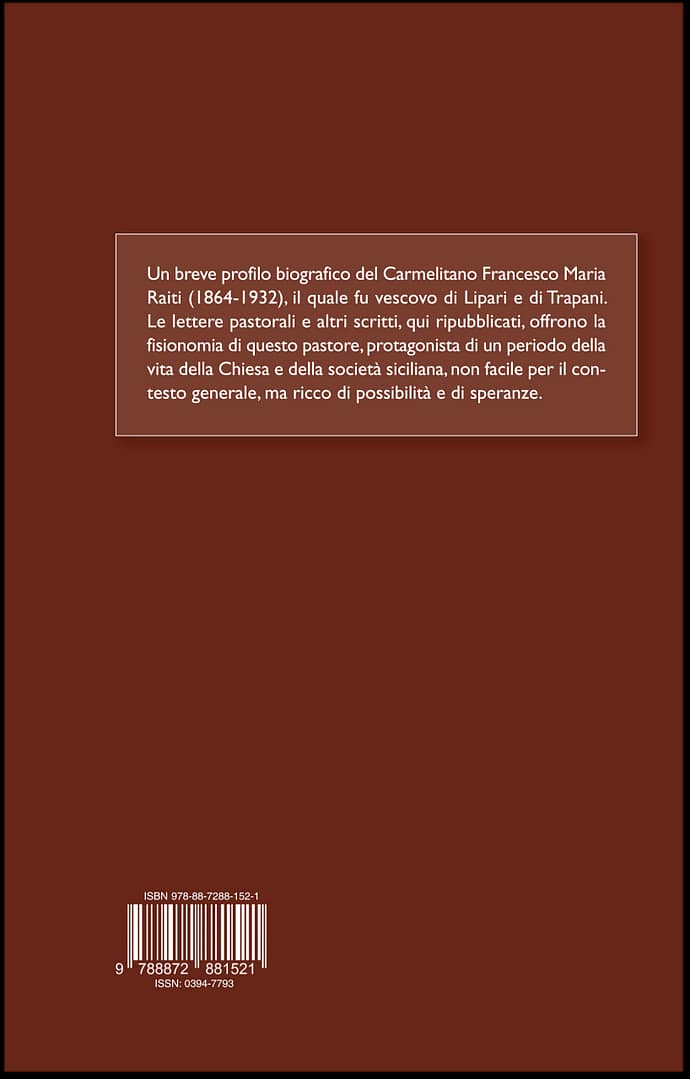 Un breve profilo biografico del Carmelitano Francesco Maria Raiti (1864-1932), il quale fu vescovo di Lipari e di Trapani. Le lettere pastorali e altri scritti, qui ripubblicati, offrono la fisionomia di questo pastore, protagonista di un periodo della vita della Chiesa e della società siciliana, non facile per il contesto generale, ma ricco di possibilità e di speranze.