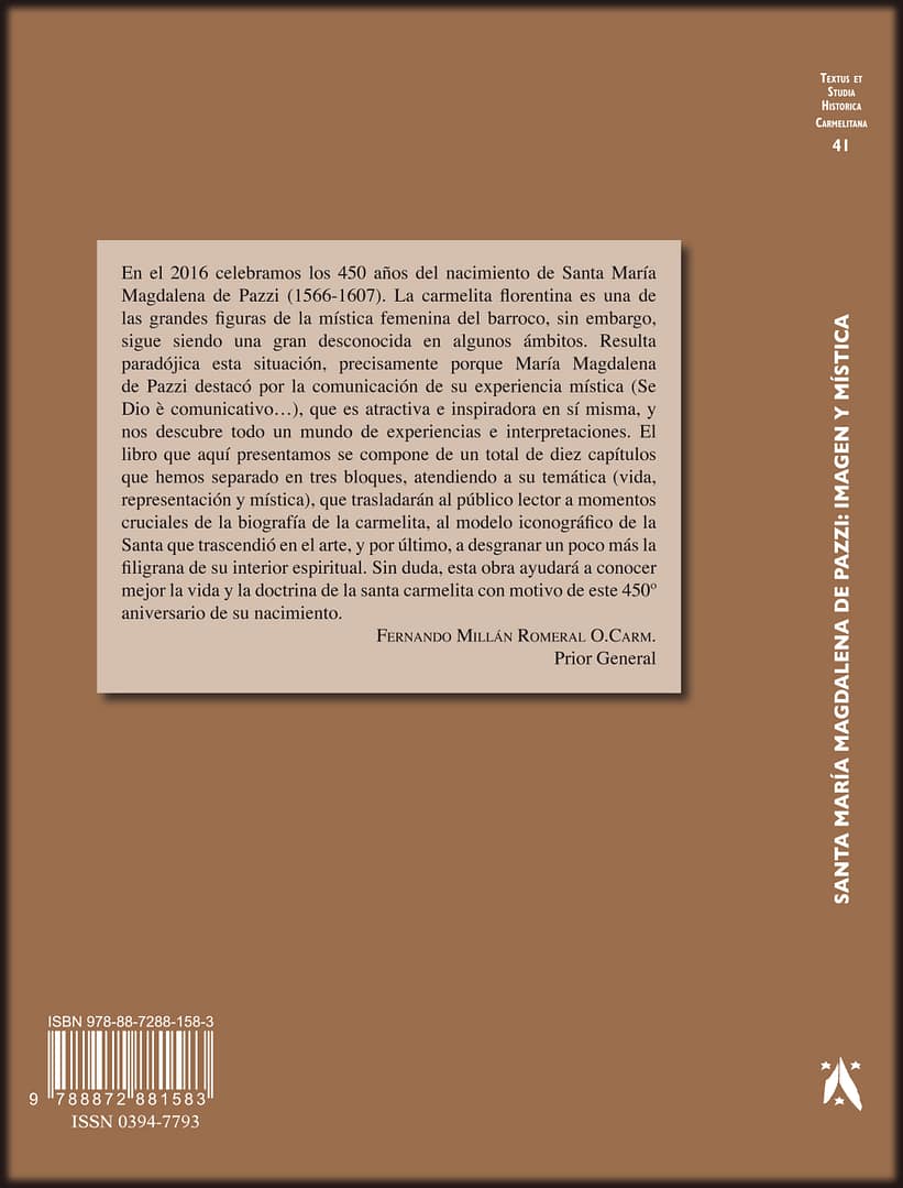 En el 2016 celebramos los 450 años del nacimiento de Santa María Magdalena de Pazzi (1566-1607). La carmelita florentina es una de las grandes figuras de la mística femenina del barroco, sin embargo, sigue siendo una gran desconocida en algunos ámbitos. Resulta paradójica esta situación, precisamente porque María Magdalena de Pazzi destacó por la comunicación de su experiencia mística (Se Dio è comunicativo…), que es atractiva e inspiradora en sí misma, y nos descubre todo un mundo de experiencias e interpretaciones. El libro que aquí presentamos se compone de un total de diez capítulos que hemos separado en tres bloques, atendiendo a su temática (vida, representación y mística), que trasladarán al público lector a momentos cruciales de la biografía de la carmelita, al modelo iconográfico de la Santa que trascendió en el arte, y por último, a desgranar un poco más la filigrana de su interior espiritual. Sin duda, esta obra ayudará a conocer mejor la vida y la doctrina de la santa carmelita con motivo de este 450º aniversario de su nacimiento.